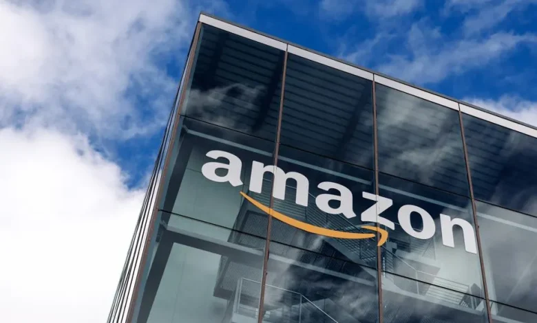 27 يناير 2025، بافاريا، ميونيخ: يمكن رؤية شعار وأحرف شركة أمازون العالمية للطلب عبر الإنترنت … المزيدتحت السماء الزرقاء على…