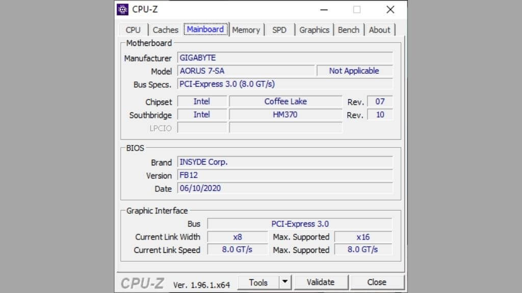 Tutto quello che devi fare è scaricare e installare l'applicazione. Poi eseguila sul tuo computer. Nel caso di CPU-Z, dovrai passare alla scheda "Scheda madre" e dovresti vedere questo.