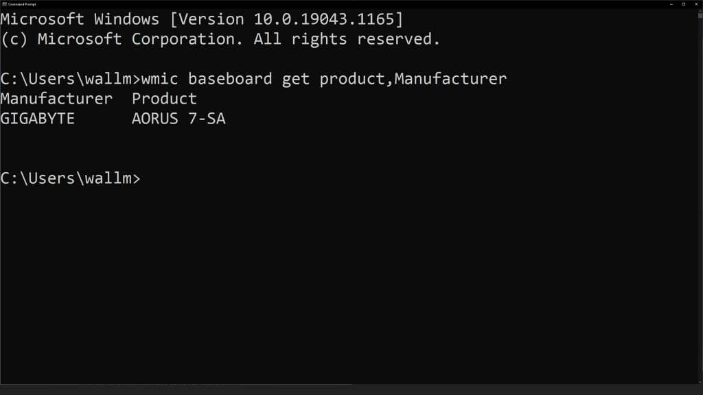 L'output indicherà il nome della scheda madre. In questo caso, stiamo utilizzando un portatile, quindi il nome della scheda madre è anche il nome del computer. Questo di solito non avviene in un sistema desktop.