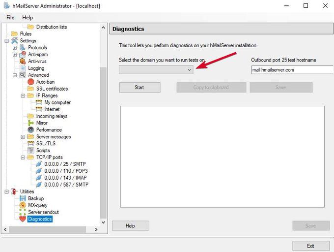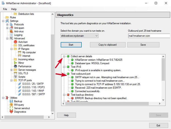 - Controlla i dettagli del server Collezionare Per visualizzare la versione di hMailServer e il tipo di database.
